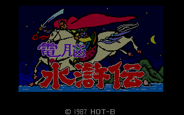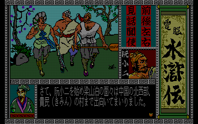 「水滸伝」を元にしたアドヴェンチャーゲーム。人物たちは原作に準じていますが、ストーリーはオリジナルのものです。シナリオは4つ用意されていて、3つまでは自由にプレイできますが、4つめだけは3つのシナリオをクリアーしていないとプレイできません。