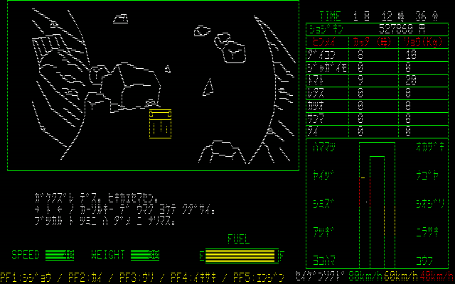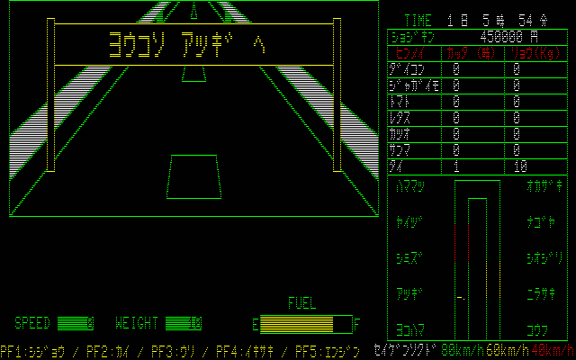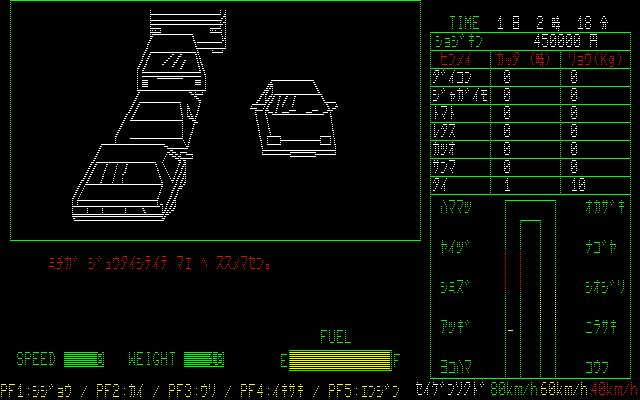 映画「トラック野郎」を元にしたと思われるゲーム。プレイヤーはトラック運転手の桃次郎。横浜~甲府間を走りながら、各所の市場状況を元に商品を売り買いし、随所で発生する様々なアクシデントを乗り越え、50万円の資本金を1,000万円にするのが目的。