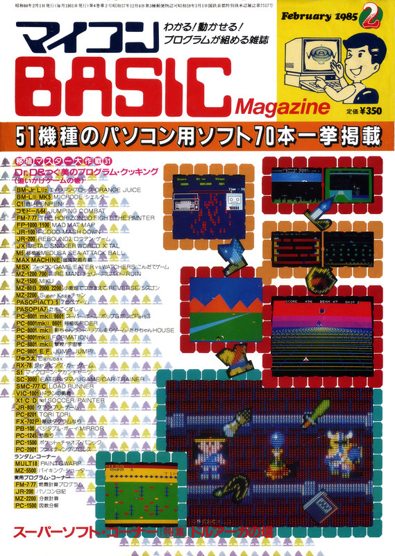 CATEGORYMAGAZINE マイコンBASICマガジン 1985年2月号 書誌データ 通巻号数46 発行日1985年2月1日 掲載プログラム一覧 THE HORIZON 3D FIGHT アクション THE PAINTER アクション