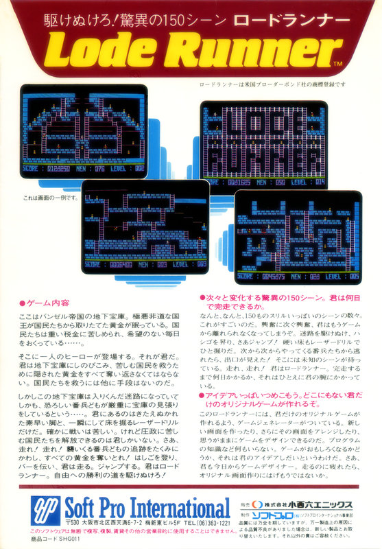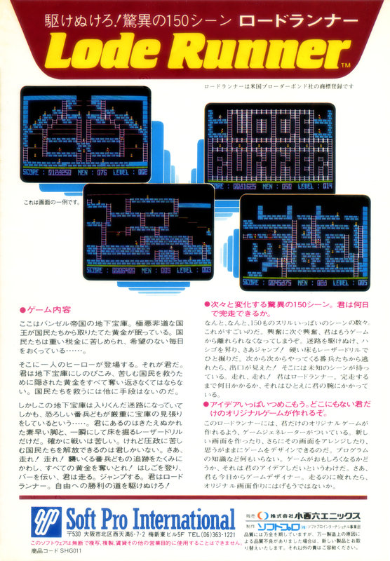CATEGORYSOFTWARE ロードランナー homeソフトプロ history1984年 リリース情報 カセットテープ版 対応機種 FM-8 FM-7 NEW7 FM-77 77L4 77L2 77AV AV40 AV20 40EX 20EX 40SX 発表年月日1984年11月 価格4,800円 価格備考- メディア本数2本 製品コードSHG011 JPAコード- 備考- 5.25インチ 2D フロッピーディスク版 対応機種 FM-8 FM-7 NEW7 FM-77 77L4 77L2 77AV AV40 AV20 40EX 20EX 40SX 発表年月日- 価格5,800円 価格備考- メディア枚数1枚 必要ドライヴ数- 製品コード- JPAコード- 備考- 3.5インチ 2D フロッピーディスク版 対応機種 FM-8 FM-7 NEW7 FM-77 77L4 77L2 77AV AV40 AV20 40EX 20EX 40SX 発表年月日- 価格5,800円 価格備考- メディア枚数1枚 必要ドライヴ数- 製品コードSHG011 JPAコード- 備考-